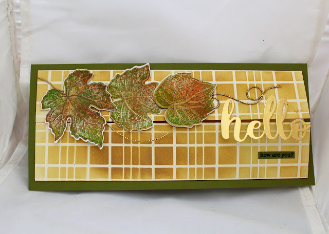The third card is also a slimline using Altenew's Plaid cover die B and Altenew's Leaf Mix die set.